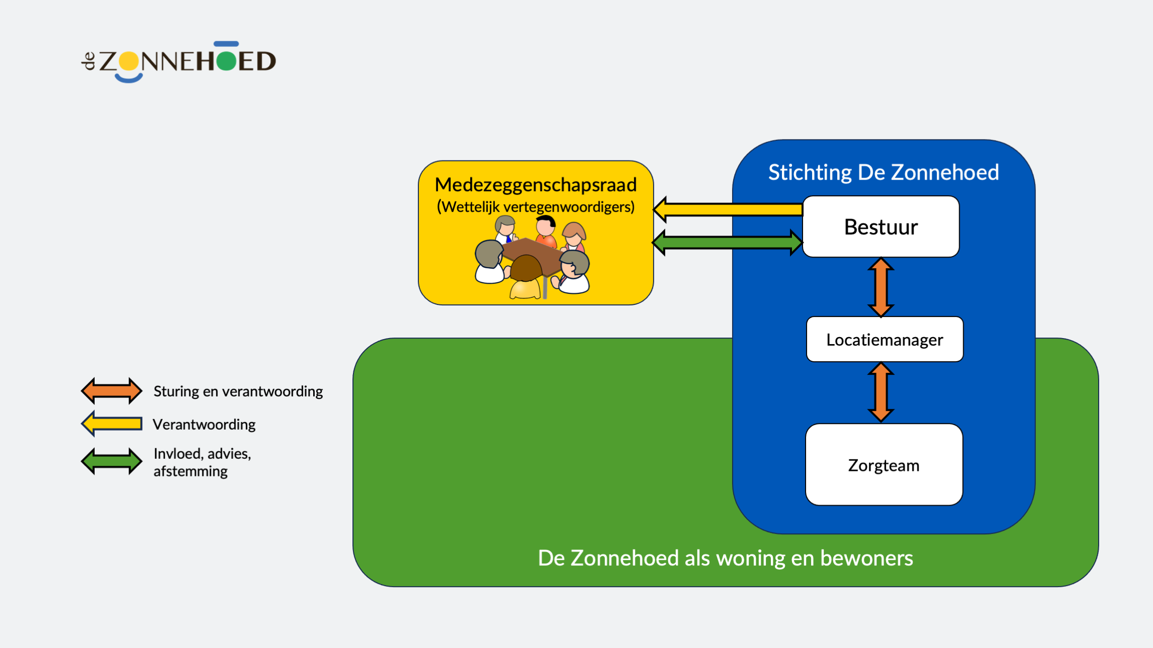 Op 22 maart 2024 is de organisatiestructuur van De Zonnehoed gewijzigd omdat vanaf 1 juli 2024 de zorg in eigen beheer is georganiseerd. Stichting De Zonnehoed heeft als doel de continuïteit van het ouderinitiatief te waarborgen. De Stichting is eindverantwoordelijk voor zowel het wonen als de zorg. De invloed en advies van en de afstemming/verantwoording met de ouders/wettelijk vertegenwoordigers van de bewoners is geborgd via een medezeggenschapsraad.